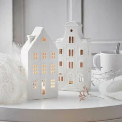 Dekorative Teelichthäuser sind eine schöne Tradition im Winter und zur Weihnachtszeit. Das Amsterdam Teelichthaus ist aus weißer Biscuit Keramik gefertigt und liebevoll gestaltet mit vielen Fenstern, durch die der Kerzenschein stimmungsvoll funkelt. In einer weiteren Variante erhältlich.