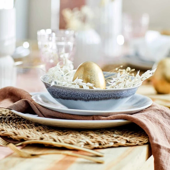 Mit unserer Geschirrserie Atlantis im angesagten Boho-Stil und organischen Formen kommt Extravaganz auf den gedeckten Tisch! Durch die reaktive Glasur entstehen unregelmäßige Farbverläufe, die jedes Teil der Serie zu einem echten Unikat werden lassen. Atlantis ist in verschiedenen Farben erhältlich, die Sie miteinander kombinieren können und so für Abwechslung auf Ihrem Tisch sorgen. Durch eine Iris-ähnliche Farbzentrierung passen alle Teile perfekt zusammen. Jedes Teil der Serie ist spülmaschinen- und mikrowellengeeignet.