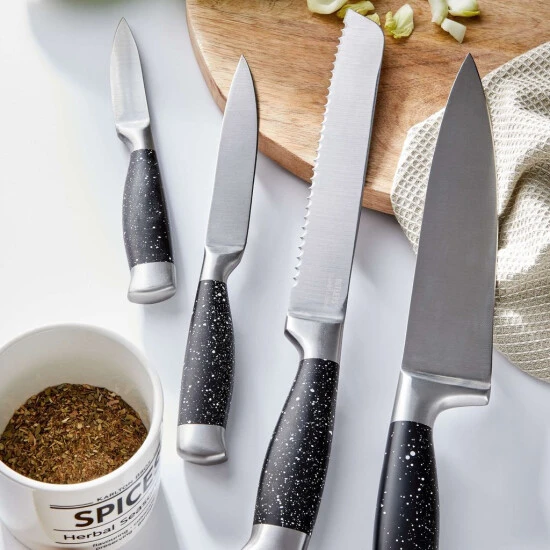 Gestochen scharf! Mit dem Bolero Messerset sind sie für jede Schnippelarbeit in der Küche ausgestattet. Ob Brötchen schneiden, Gemüse schnippeln oder unerwünschte Ränder vom Sonntagsbraten abschneiden – die hochwertigen Edelstahlmesser mit schwarzem Griff und weißen Sprenkeln sind allzeit bereit für Ihren Einsatz. Damit die dekorativen Küchenmesser auch immer griffbereit sind gibt es auch den passenden Messerblock für Ihre neuen Küchenhelfer aus der Bolero-Reihe.