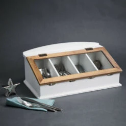 Ein Blickfang auf jeder Anrichte oder Arbeitsfläche: In diesem Besteckkasten mit gläsernem Deckel sind Messer, Gabel & Co. griffbereit und sauber aufbewahrt. Deckel zum Aufklappen. Den unbeschwerten Zauber Südfrankreichs bringt Ihnen die Serie Campagne ins Haus. Jedes Teil unterstreicht den persönlichen Charakter Ihres Zuhauses – und ist nur für den Innenbereich geeignet.