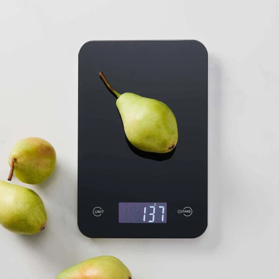 Sieht stylish aus und leistet präzise Arbeit: Mit der Count on Me Digital Waage wiegen Sie Mehl, Zucker, Haferflocken, Nüsse etc. bis auf 1 Gramm genau ab – und das bis zu einem Gesamtgewicht von 5 kg. Darüber hinaus können Sie sich per Druck auf die integrierten Sensortasten die ml-Angaben für Milch und Wasser anzeigen lassen. Mit Zuwiegefunktion. Vollkommen glatte Oberfläche, keine Ecken und Kanten. Digitale LCD-Anzeige mit weißem Hintergrundlicht, energiesparende Abschaltautomatik, sicherer Stand mit Antirutschfüßen. Inklusive 2x CR2032 Batterien.