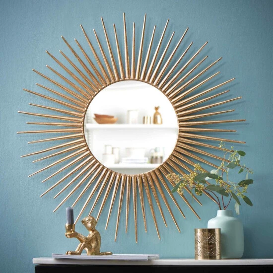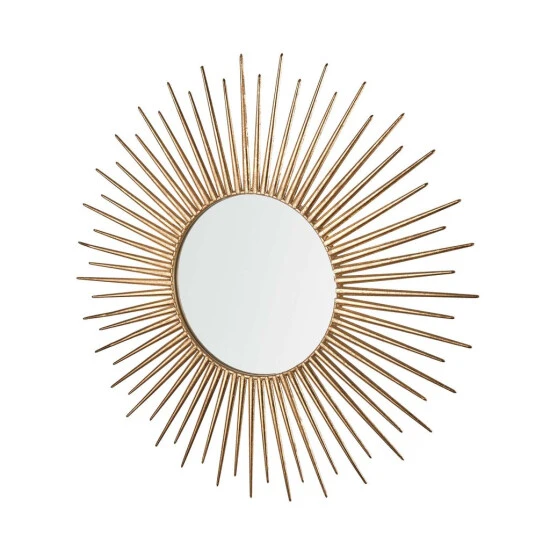 Ein dekoratives Trend-Piece für Ihre Zuhause: Der Del Sol Spiegel aus Glas lässt mit seinen Strahlen aus goldenem Eisen die Sonne in Ihrem Flur, Bad oder Wohnzimmer aufgehen. Zum besonderen Blickfang wird er dabei auf farbigen oder dunkeln Wänden, aber auch Pastell bringt den Wandspiegel schön zur Geltung.