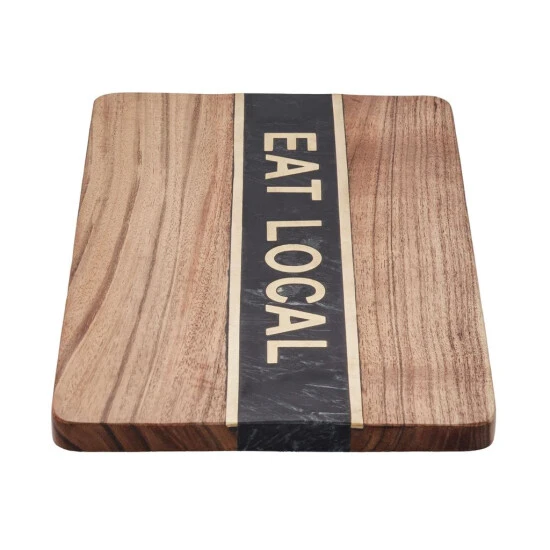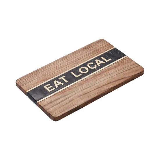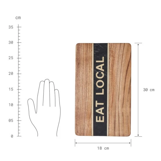 In Ihrer Küche oder Ihrem Esszimmer wird das Eat Local Deko Holzbrett zu einem coolen Statement: Es kombiniert die wertigen Materialien Akazienholz, Marmor und Messing zu einem coolen Look mit klarer Botschaft. Als Blickfang stellen Sie das Dekobrett auf, z.B. auf der Arbeitsplatte, der Anrichte oder einem Board, lässig angelehnt an die Wand. Natürlich kann sich das markante Holzbrett auch als Tischdeko gut sehen lassen, oder Sie befestigen es wie ein Schild an der Wand.