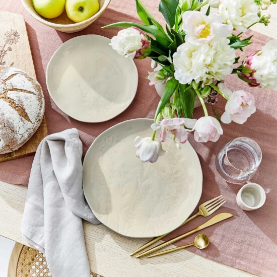 Die limitierte Geschirrserie Fleur mit Crackle-Glasur: Ein guter Morgen beginnt mit einem schön gedeckten Tisch, auf dem Ihnen der Fleur Frühstücksteller im 4er-Set ein erstes Lächeln ins Gesicht zaubert. Denn dieser organisch geformte Steinzeug-Teller verbindet ein zartes Gräser- bzw. Blumendesign mit einem feinen Craquelé. Leicht verspielt wirkt dieses Design, das wunderbar mit dem modernen Landhausstil und allen natürlichen Looks harmoniert. Die beige Geschirrserie Fleur wird durch passende Espressotassen und Dinnerteller komplementiert.