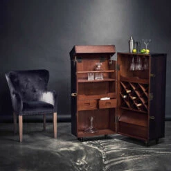 Rastlos wie der Schriftsteller war, führte es Hemingway von Chicago nach Paris, von Venedig nach Spanien, vom Kilimandscharo nach Havanna und von den Rocky Mountains bis an den Nil. Da kann man natürlich nicht ständig auf die Annehmlichkeiten des Lebens verzichten, z. B. einen gut gemixten Drink. Und deshalb kam Butlers die Idee, einen Barschrank zu entwickeln, der an die Schrankkoffer von früher erinnert. In kompakter Form bietet er, neben einem verdecktem Fach, exklusiven Platz für Ihren Lieblingswein, Gläser und Barutensilien – originell und praktisch im Design. Weitere Hemingway-Möbel erhältlich.
