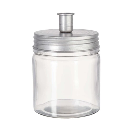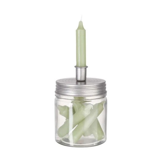 Raffiniert: Das Candle Jar Glas mit Kerzenhalter setzt dem Aufbewahrungsglas für Little Light Kerzen noch einen drauf: Auf dem Deckel aus silberfarbenem Metall kann eine der sieben salbeifarbenen Little Light Kerzen befestigt werden. Sobald sie abgebrannt ist, ist Nachschub ohne langes Suchen griffbereit. Ganz schön praktisch dieses 2-teilige Set – und dekorativ sowieso.