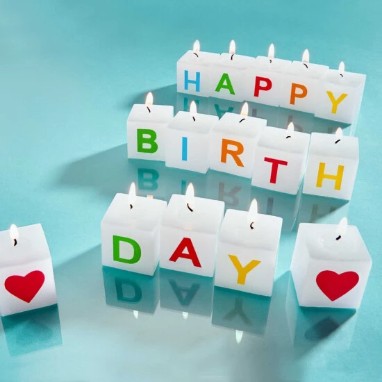 Für einen leuchtenden Start ins neue Lebensjahr steht die Love Letters Kerze Happy Birthday. Fünfzehn weiße Kerzen in Würfelform ergeben gemeinsam den Schriftzug „Happy Birthday“, die auf einer Seite je einen bunten Buchstaben oder Herz tragen.