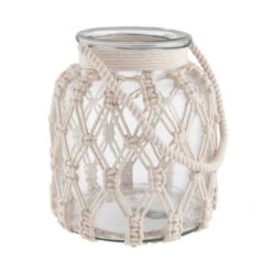 Der angesagte Macramé Look harmoniert perfekt mit den Einrichtungstrends Boho, Landhaus und Vintage, wie dieses Macramé Glas Windlicht auf Ihrem gedeckten Tisch zeigt. Oder Sie nutzen das dekorative Windlicht, um damit in den Abendstunden stimmungsvolle Akzente auf einem Beistelltisch, Board oder Regal zu setzen.