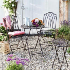 Ihr Balkon oder Garten wird zu einem Ort meditativer Ruhe und Harmonie mit dem Mandala Garden Bistroset, bestehend aus einem runden Tisch und zwei Stühlen. Hier malen Sie ganz entspannt aufwändige Mandalas – oder malen sich den Tag in schönsten Farben aus.