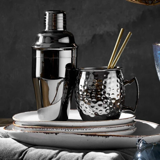 Beim Mixen unterstützt Sie dieser professionelle Manhattan-Cocktailshaker. Zum Abseihen enthält er einen Siebeinsatz, zum Shaken einen Deckel. Übrigens: Wer seinen Martini geschüttelt mag, gibt einfach 6 cl Gin, 1 cl trockenen Wermut und gestoßenes Eis in den Shaker. Schütteln, abseihen und mit einer entsteinte grüne Olive dekorieren.
