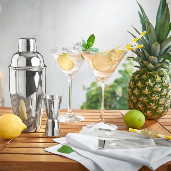 Für einen echten Manhattan brauchen Sie 3 Eiswürfel, 8 cl Bourbon, 2 cl Martini, 2 cl Martini rosso, eine Cocktailkirsche – und natürlich das Manhattan Lounge Cocktail Set. Mit Shaker, Barsieb, Strohlöffel, Zange und Messbecher aus hochwertigem rostfreiem Edelstahl enthält es die wichtigste Grundausstattung für Ihre Hausbar. Fassungsvermögen 550 ml.