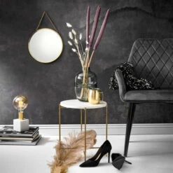 Unser Beistelltisch aus der Marble-Serie erweist sich mit Marmorplatte und faltbarem Gestell als modernes Multitalent beim Einrichten und Dekorieren. Zeitlos schön und modern zugleich eignet er sich ideal als Couchtisch, Buchablage oder Deko-Eyecatcher. Über dem antik anmutenden Goldgestell befindet sich zudem eine edle Platte, die auch separat als Dekoplatte genutzt werden kann. Funktional verfügt das Möbelstück über ein faltbares Gestell, welches ein schnelles und einfaches Zusammenklappen ermöglicht.