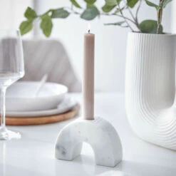 Weißer Marmor ist edel und so angesagt. Deshalb verlieben Sie sich auf den ersten Blick in den modernen Marble Stabkerzenhalter Bogen und machen ihn ganz schnell zum erklärten Lieblingsaccessoire auf dem gedeckten Tisch. Oder sie platzieren den Kerzenhalter dekorativ auf einem Board oder Beistelltisch. Passende Marble Deko Objekte und Teelichthalter, ideal auch zum Kombinieren.