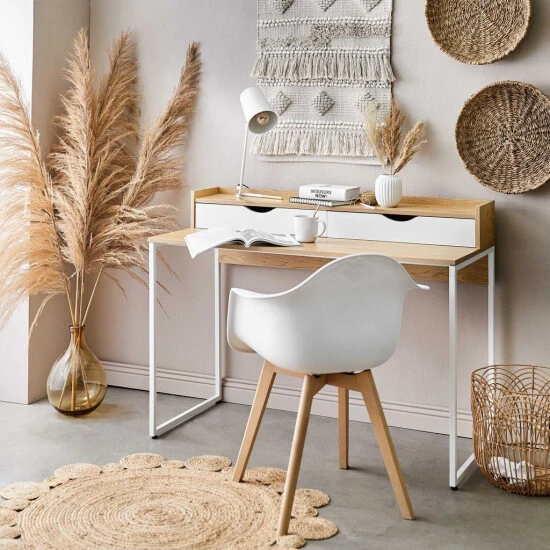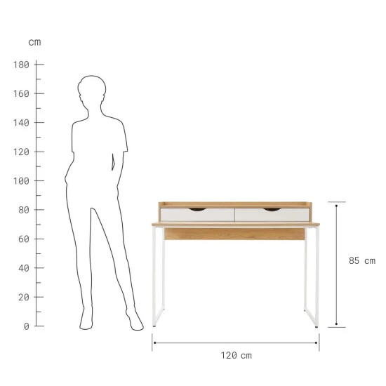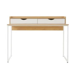 Einen modernen Gegenentwurf zu wuchtigen Arbeitsplätzen liefert der Modernist Schreibtisch. Mit seiner leichten Optik (bei schwerem Gewicht) und seiner hellen Farbgebung in Weiß und Natur lässt er sich wunderbar auch in die Einrichtung im Wohnzimmer oder Schlafzimmer integrieren, ohne das Ihr Zuhause nach Büro aussieht. Zugleich beweist der Modernist Schreibtisch Sinn für das Praktische: Eine Ablage und zwei Schubladen schaffen Platz und Ordnung.