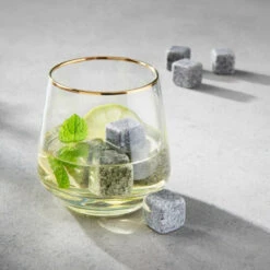 Die On The Rocks Kühlsteine halten Ihr Getränk erfrischend kalt, auch wenn es draußen warm ist oder Sie sich gerne Zeit beim Genießen lassen. Ziemlich cool ist übrigens auch der optische Effekt im Glas, auch bei farbigen Drinks. Inklusive Samtbeutel.