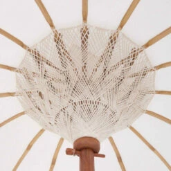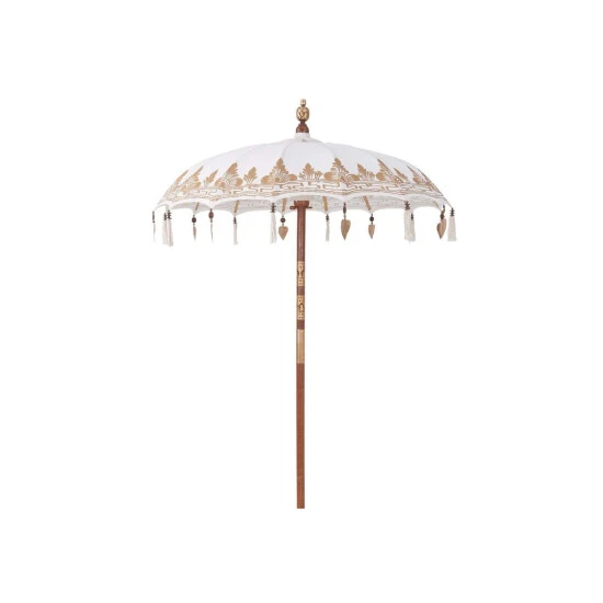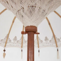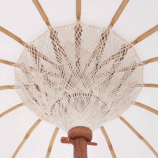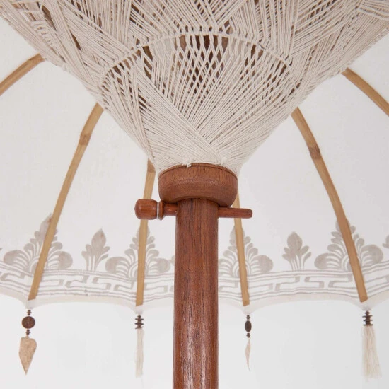 Ein Märchen aus 1000 und 1 Nacht wird wahr bei der kleinen Version des exotischen Oriental Lounge-Sonnenschirm in creme. Das prachtvolle Schmuckstück ist am Bezug mit Goldapplikationen und Ornamenten versehen, dazu mit Quasten und Dekoherzen aus Aluminium bestückt. Die Schirmspitze wurde aufwändig gestaltet, ebenso der Stab. Innen schaut man auf zu einer Jute-Verkleidung in Makramee-Handarbeit. Bei dieser außergewöhnlichen und wertvollen Aufmachung ist der Schirm natürlich nicht geeignet, um dauerhaft oder bei schlechtem Wetter draußen zu bleiben. In weiteren Varianten erhältlich. Der The Rock-Schirmständer ist separat bei Butlers erhältlich.