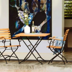 Klappbare Gartenmöbel wie die Parklife-Sitzgruppe mit Tisch und zwei Armlehnstühlen sind einfach unschlagbar. Wenn Sie morgens und nachmittags in der Sonne sitzen wollen. Wenn Sie zwischendurch Platz für eine Partie Croquet brauchen. Oder wenn Ihr Schuppen bzw. Ihre Garage kleiner ist als ein Flugzeughangar. Und wenn Sie das Wegklappen mal vergessen – die wetterfesten Outdoor-Möbel sind nach handwerklicher Tradition aus geöltem Akazienholz und verzinktem Metall gefertigt und trotzen auch mal einem kleinen Schauer.