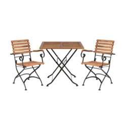 Klappbare Gartenmöbel wie die Parklife-Sitzgruppe mit Tisch und zwei Armlehnstühlen sind einfach unschlagbar. Wenn Sie morgens und nachmittags in der Sonne sitzen wollen. Wenn Sie zwischendurch Platz für eine Partie Croquet brauchen. Oder wenn Ihr Schuppen bzw. Ihre Garage kleiner ist als ein Flugzeughangar. Und wenn Sie das Wegklappen mal vergessen – die wetterfesten Outdoor-Möbel sind nach handwerklicher Tradition aus geöltem Akazienholz und verzinktem Metall gefertigt und trotzen auch mal einem kleinen Schauer.