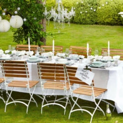 Klappbare Gartenmöbel wie die Parklife-Sitzgruppe mit Tisch und vier Stühlen sind einfach unschlagbar. Wenn Sie morgens und nachmittags in der Sonne sitzen wollen. Wenn Sie zwischendurch Platz für eine Partie Croquet brauchen. Oder wenn Ihr Schuppen bzw. Ihre Garage kleiner ist als ein Flugzeughangar. Und wenn Sie das Wegklappen mal vergessen – die wetterfesten Outdoor-Möbel sind nach handwerklicher Tradition aus geöltem Akazienholz und verzinktem Metall gefertigt und trotzen auch mal einem kleinen Schauer.