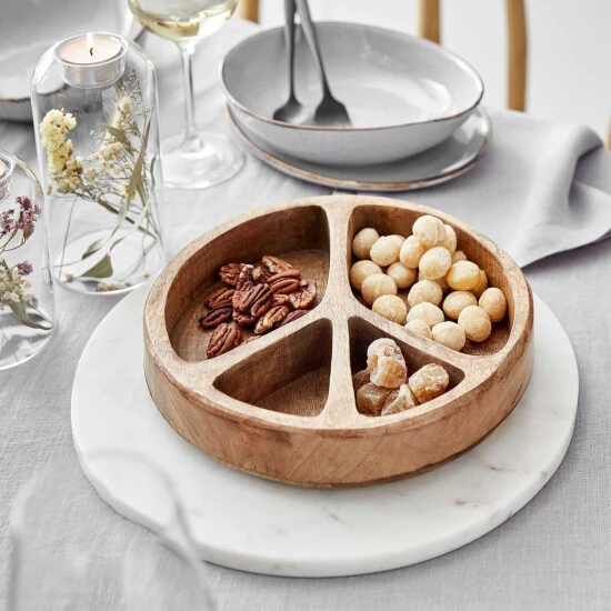 Chips, Nüsse und Cracker bringen Sie mit der Peace Snackschale formvollendet auf den Tisch. Die Schale aus Mangoholz lassen sich zum Aperitif oder zum Fernsehabend lecker füllen.