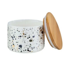 Die Königin unter den Aufbewahrungsdosen heißt Queen it. Optisch regiert das moderne Design mit dekorativem gesprenkeltem Muster, praktisch nimmt der Bambus-Deckel mit Silikondichtung alle möglichen Inhalte schützend unter seine Fittiche. Verschiedene Größen und Varianten erhältlich, die sich prächtig im Badezimmer oder in der Küche, im Regal und auf dem gedeckten Tisch kombinieren lassen.