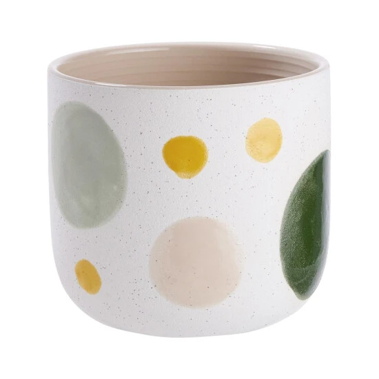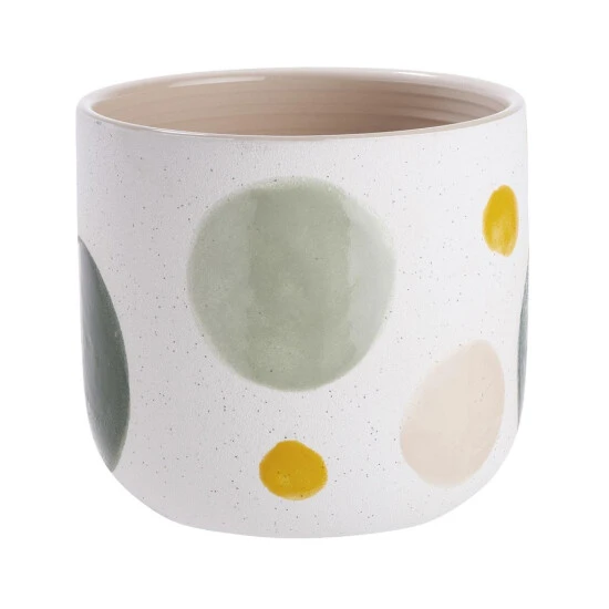 Organische Kreise im Stil der 70er Jahre zieren den bunten Seventies Blumentopf aus Steinzeug und feiern so ihr gelungenes Design-Comeback. Darüber freuen sich Sukkulenten, Kakteen und andere Topfpflanzen ebenso wie Ihr hübsch eingerichtetes Zuhause. Oder Sie integrieren den Blumentopf mit Pflanze in Ihre Tischdeko und setzen damit besondere Akzente. In einer weiteren Größe erhältlich.