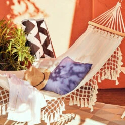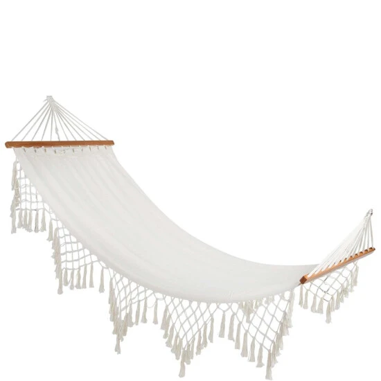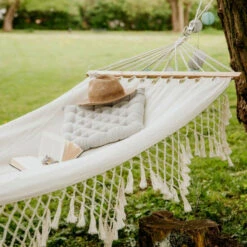 In der Show Me Heaven Hängematte in Creme mit Troddeln lassen Sie ganz gechillt die Seele baumeln. Bei einem guten Buch und einem kalten Getränk in der Sonne. Bei lachenden Kindern im Garten und Schmetterlingen, die durch den Sommerhimmel flattern.