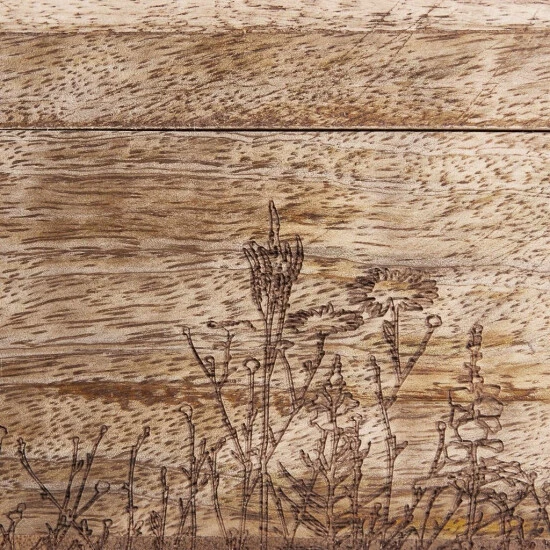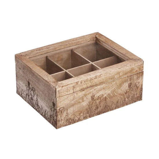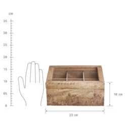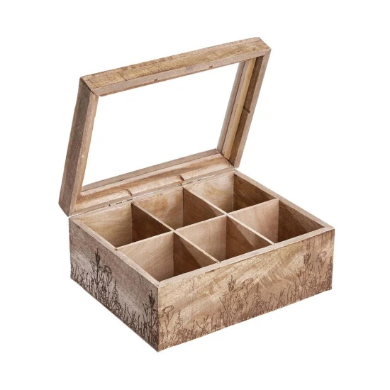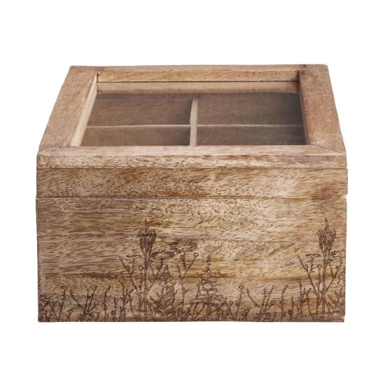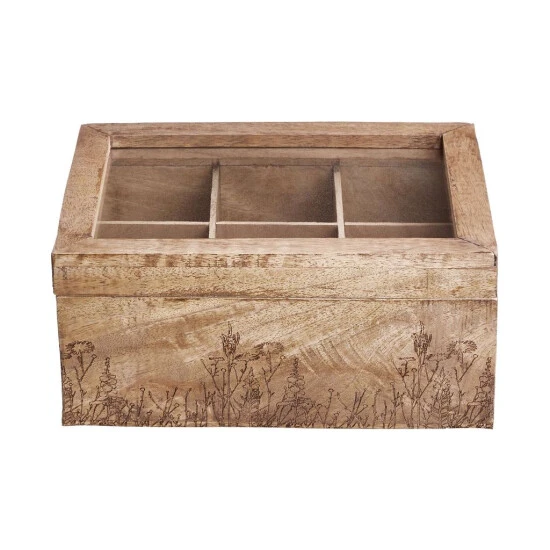 Alle Ihre Teesorten griffbereit: In der Tea Time Teebox mit Blumen-Lasergravur aus braunem Mangoholz verstauen Sie jede Menge Teebeutel übersichtlich und kompakt. Die dekorative Box braucht sich dabei nicht im Schrank zu verstecken und kann beispielsweise auf dem Frühstückstisch oder der Anrichte stehen bleiben – von Teatime zu Teatime.