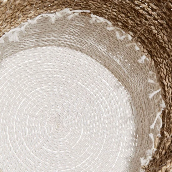 Boho-Stil und Strandfeeling – das macht den Look des White Beach Korbs mit Griffen aus. Er ist aufwändig aus den Naturmaterialien Pandanus und Baumwolle gearbeitet, als weiteres Material kommt Kunststoff hinzu. Seine besondere Optik erhält der Korb durch die Farben Natur und Weiß sowie durch die fein gespannten Fäden, die an Stickereien oder Makramee erinnern. Da suchen Sie doch gleich nach einer leichten Decke oder anderen Sommeraccessoires, die sich dekorativ verstauen lassen. Tipp: Kann auch anstelle eines Übertopfes für Pflanzen verwendet werden. Weitere Größen erhältlich, ideal auch zum Kombinieren.